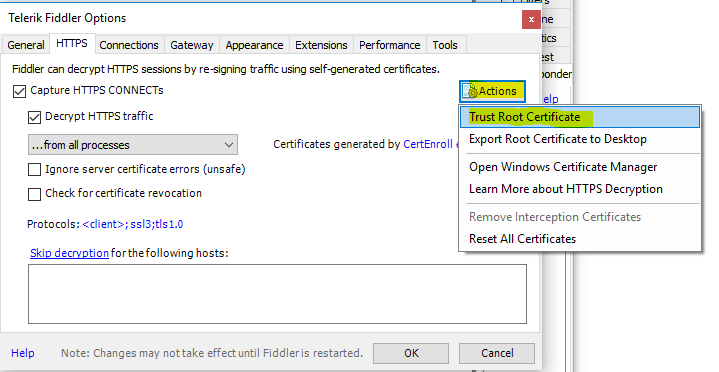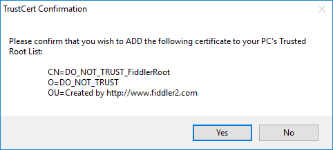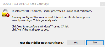 可怕的文字是關於 https 流量被 Fiddler 看到的警告。Fiddler 的根憑證現在受信任,這意味著 Fiddler 可以生成您的應用程式(包括您的瀏覽器)信任的憑證。