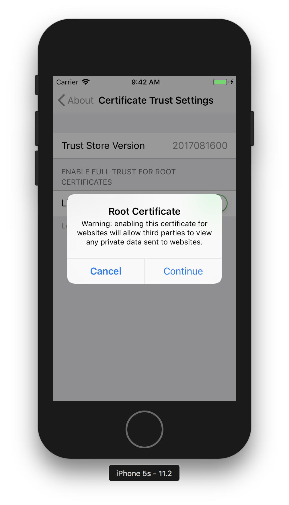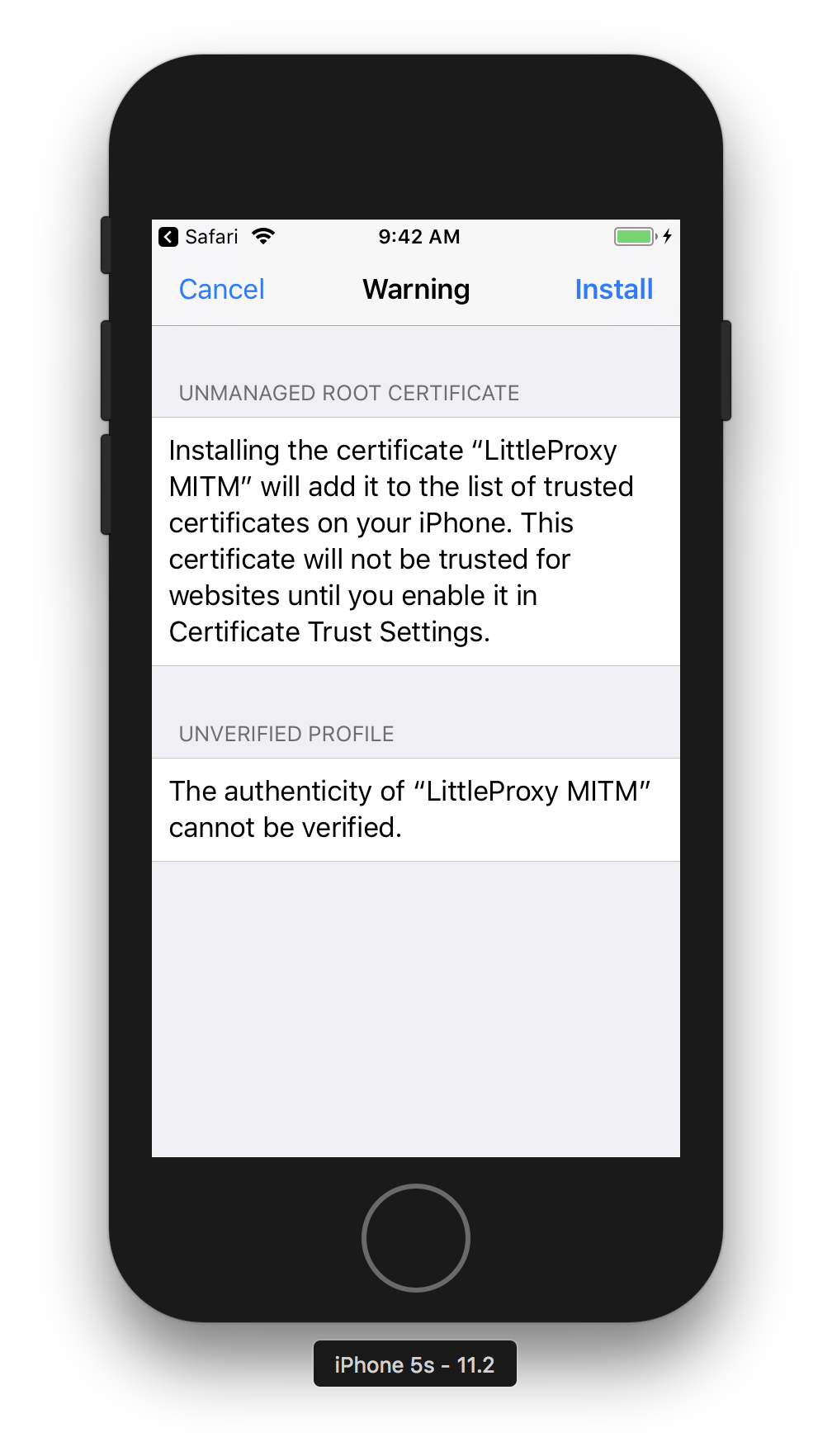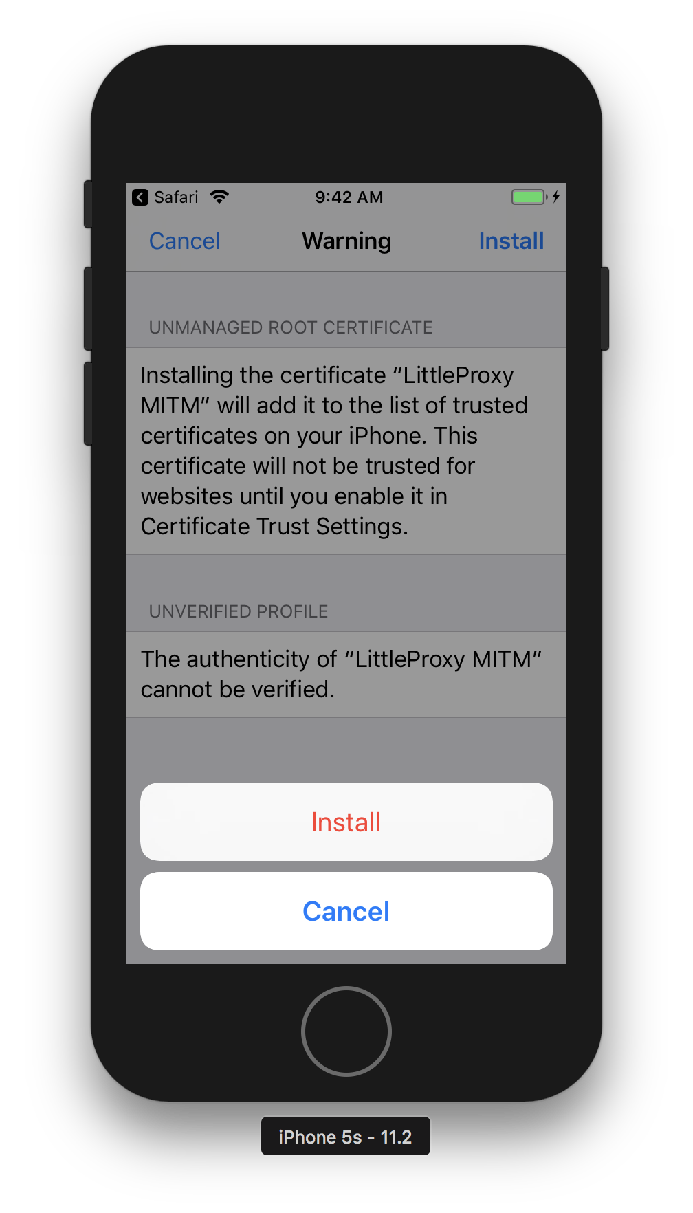 在 iOS 上信任除錯代理(如 BrowserMob-Proxy)的根憑證在其前進方向上相當嚴格。您可以使用裝置的 Safari 從 ca-certificate-rsa.cer 下載憑證,或者您也可以將檔案拖曳到模擬器中。