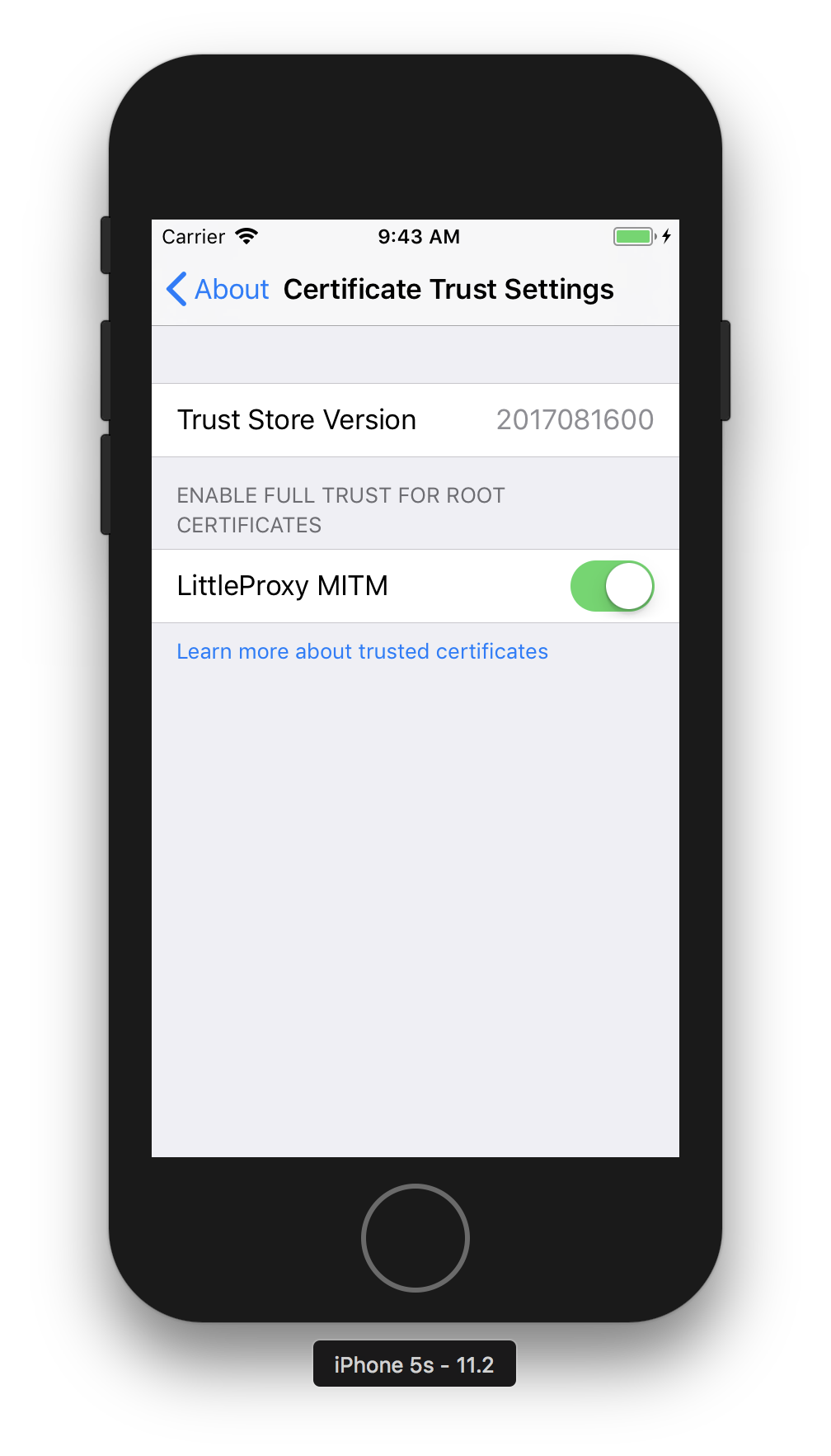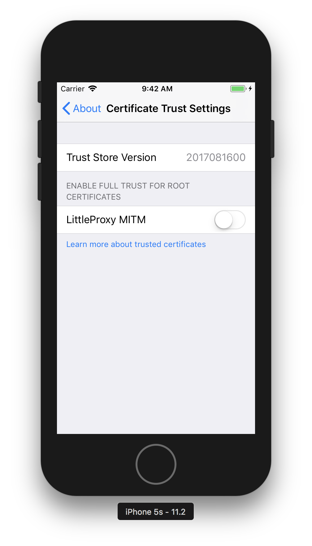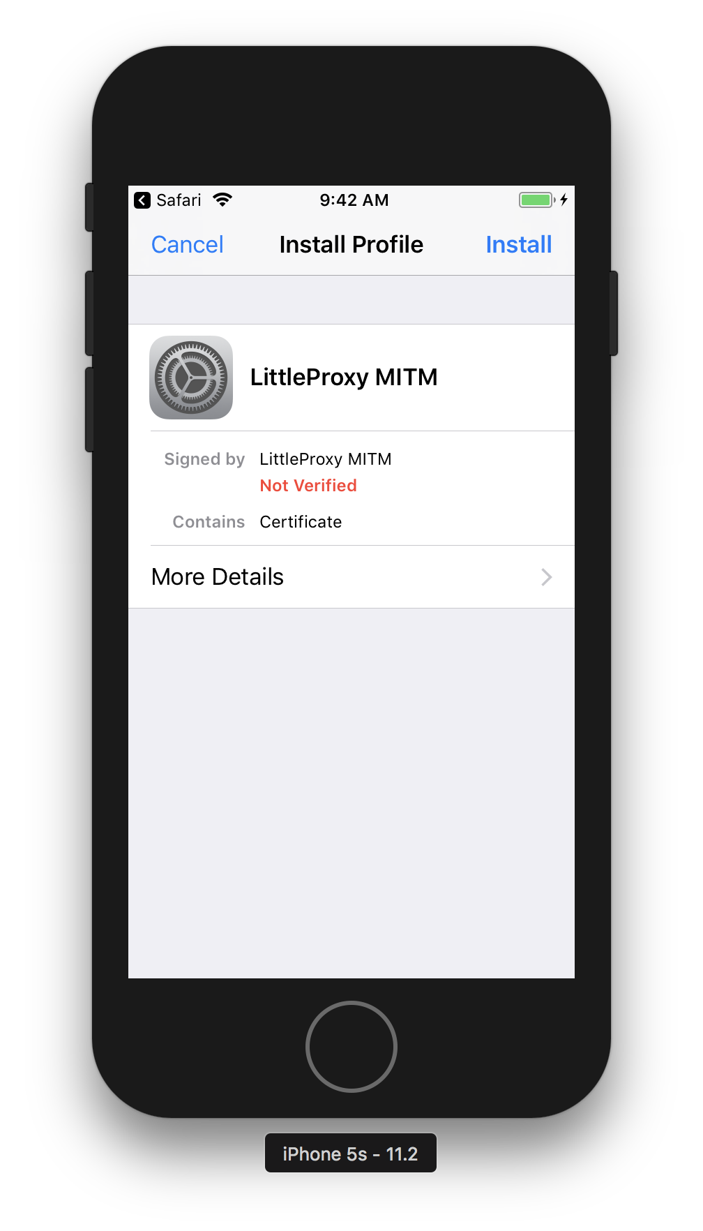 在 iOS 上信任除錯代理(如 BrowserMob-Proxy)的根憑證在其前進方向上相當嚴格。您可以使用裝置的 Safari 從 ca-certificate-rsa.cer 下載憑證,或者您也可以將檔案拖曳到模擬器中。